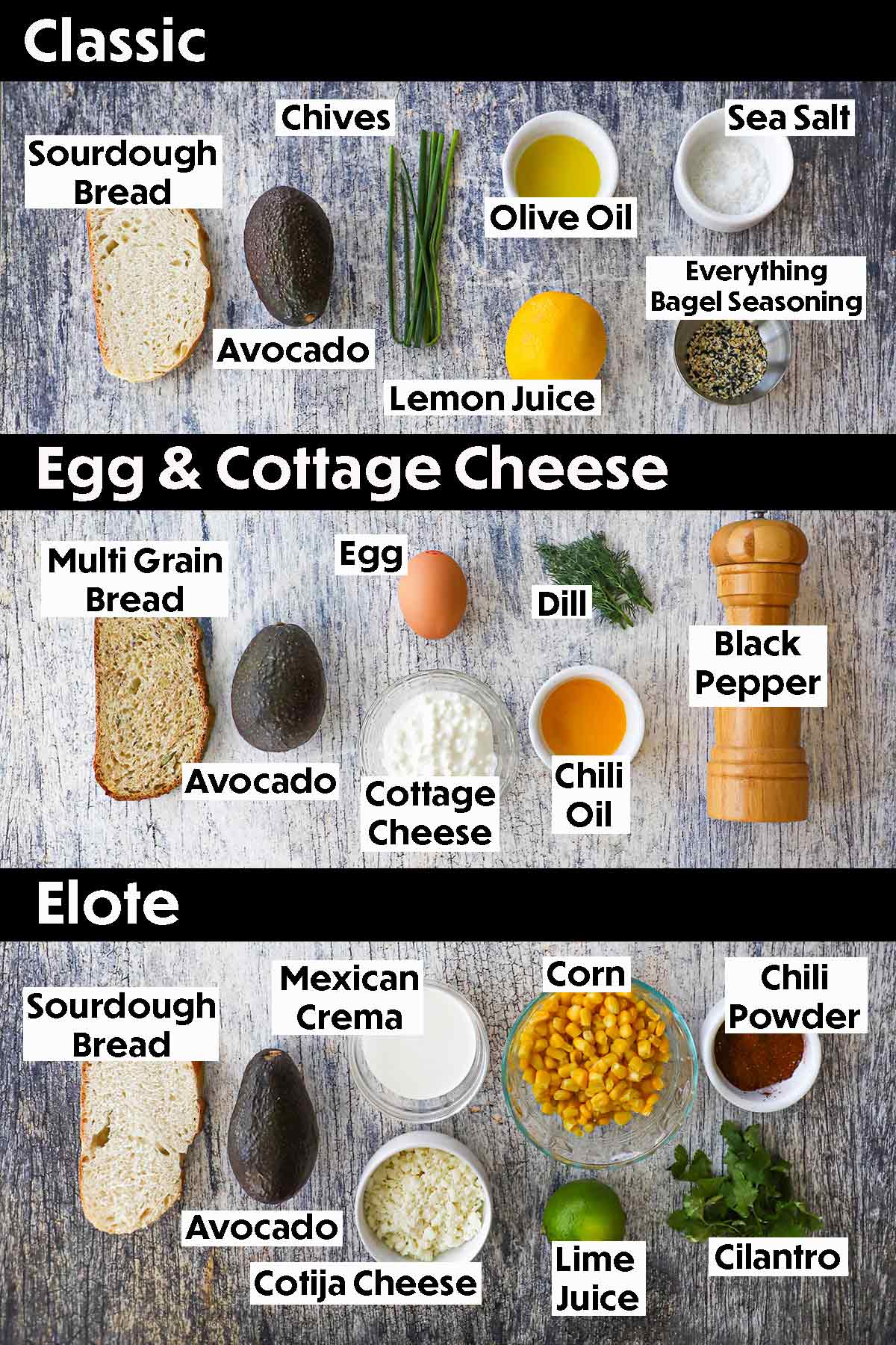 - Avocado Toast 3 Ways: Classic, Protein, and Eloté