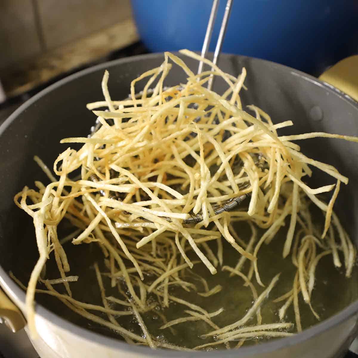 • Safety First: Only fill your frying pot about ⅓ full with oil. When the shoestring potatoes hit the hot oil, they will bubble up vigorously; frying in small batches is essential to prevent dangerous hot oil overflow and ensure the oil temperature stays high for a “shatter-crisp” finish.